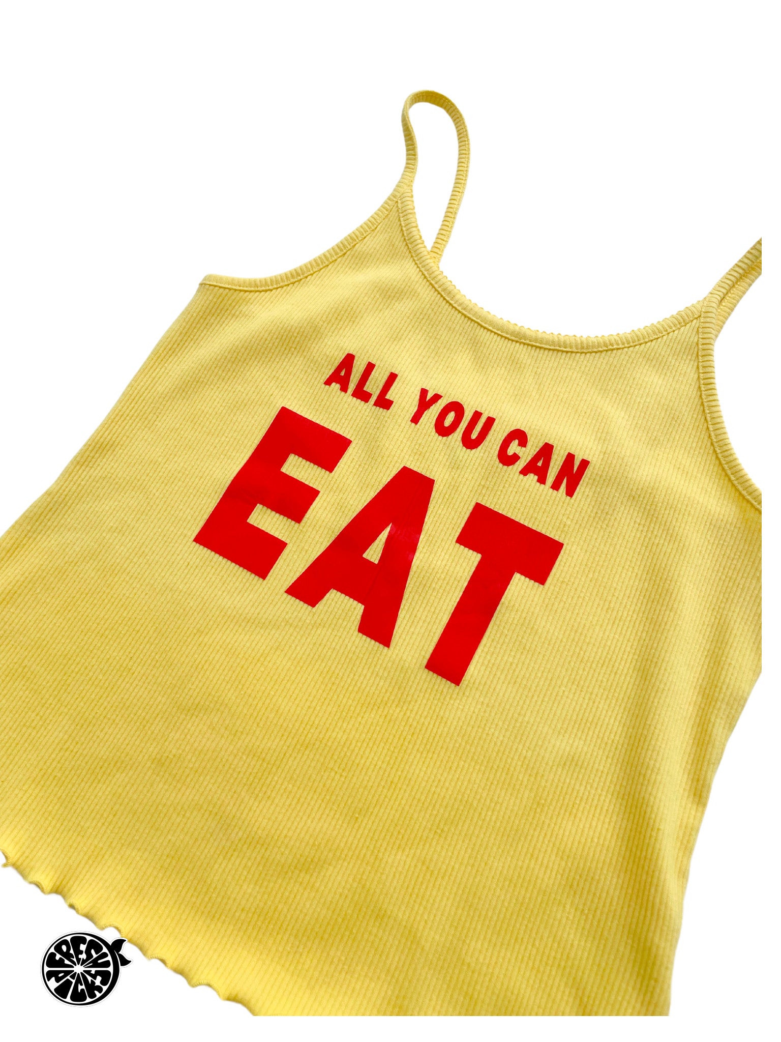 Shop Now: Don’t miss your chance to own this exclusive size Large tank top! Order your Upcycled All You Can Eat Yellow Tank Top today and add a unique, sustainable piece to your wardrobe.