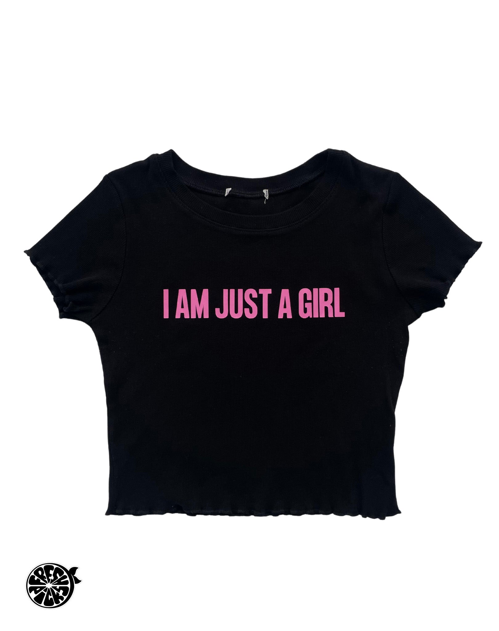 - Unique Design: Handcrafted from upcycled materials, this crop t-shirt features a bold "I Am Just A Girl" graphic with a striking pink and black color palette for a nostalgic Y2K aesthetic.