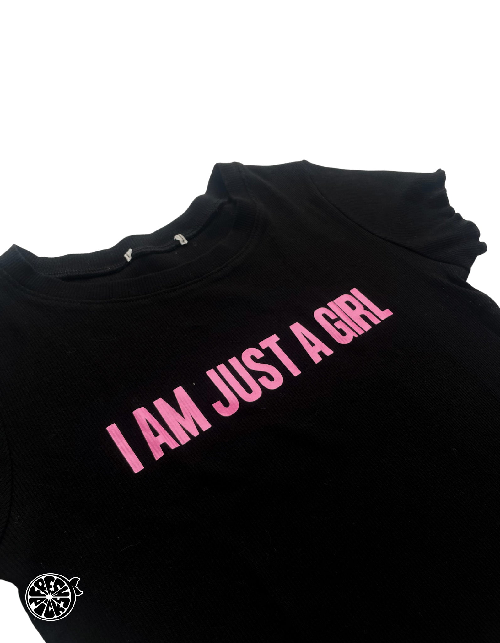 Embrace the early 2000s vibe with our Upcycled I Am Just A Girl Y2K Pink and Black Crop T-shirt, a 1-of-1 exclusive in size Large. This fun and bold tee combines Y2K nostalgia with sustainable fashion, perfect for anyone looking to make a stylish statement.